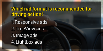 Which ad format is recommended for driving action? Responsive ads TrueView ads Image ads Lightbox ads